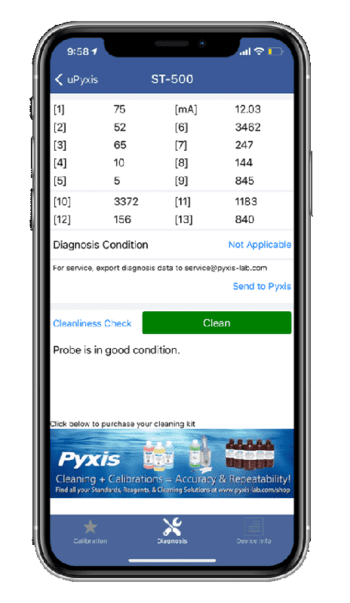Keep up on the quality of your inline sensors by running the Pyxis Lab® Cleanliness Check directly on your uPyxis® app. Simply select the ‘Cleanliness Check’ option and the uPyxis® app will immediately notify whether your sensor is ‘Clean’ or ‘Dirty’.
