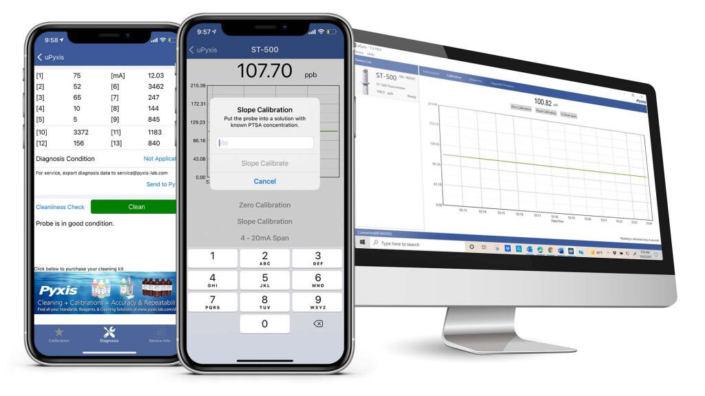 - Wireless Data Transfer, Firmware Updates and Sensor Calibration via uPyxis APP The uPyxis APP manages all Pyxis portable meter and inline sensors on mobile and desktop devices, including Apple iPhones and Samsung Android smartphones. Users may utilize the uPyxis APP to customize product name display, download custom measurement curves, transfer data log contents and update firmware to the SP-800 and all other Pyxis handheld devices. Each SP-800 is integrated with Bluetooth 5.0 and can dialog directly with uPyxis Mobile or PC devices for this purpose.